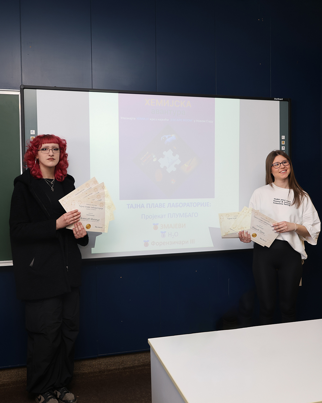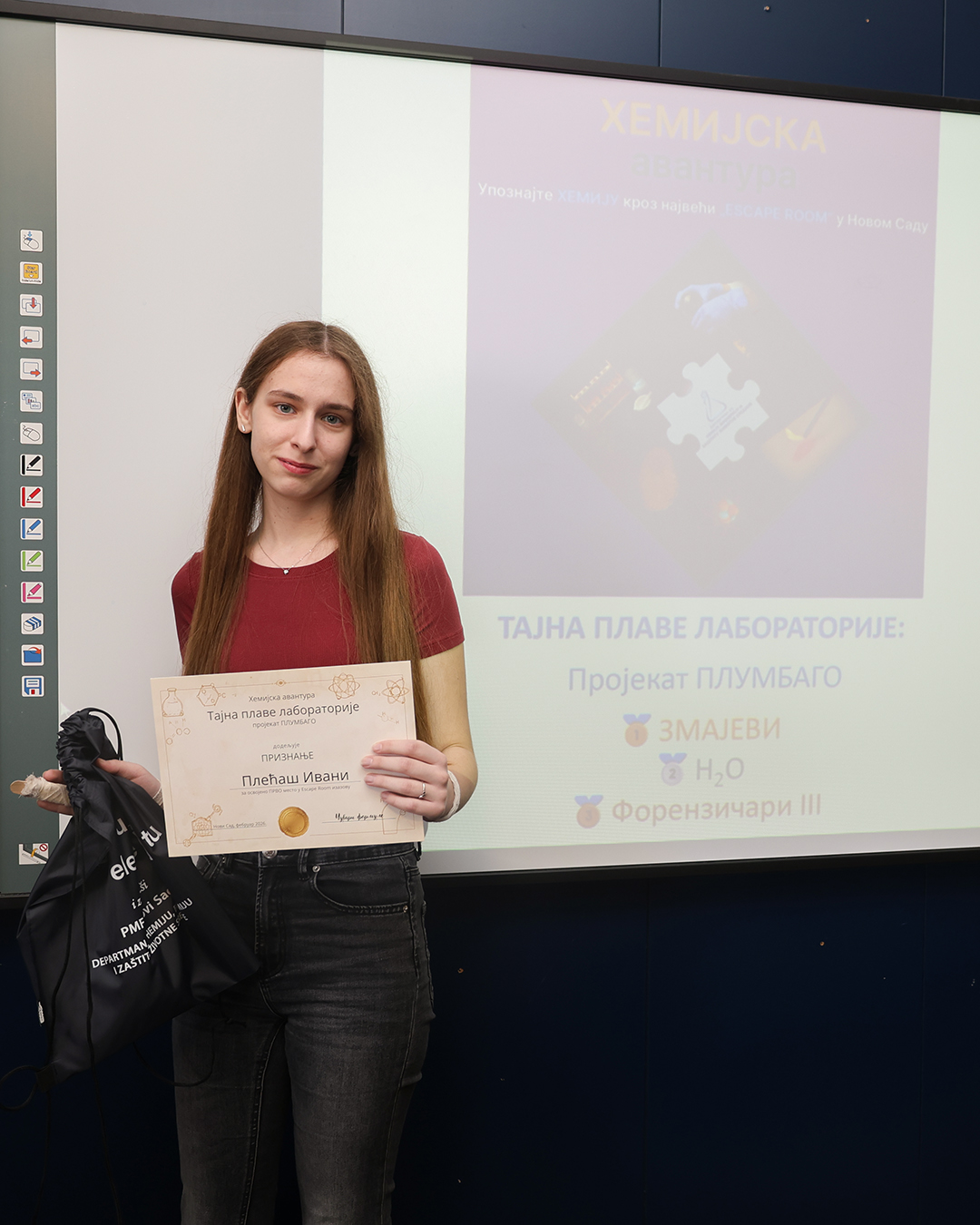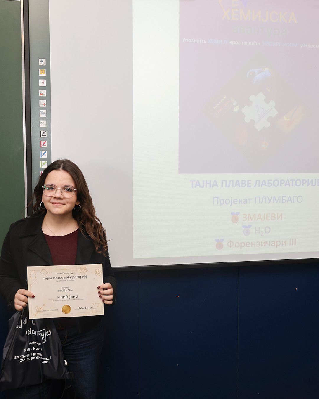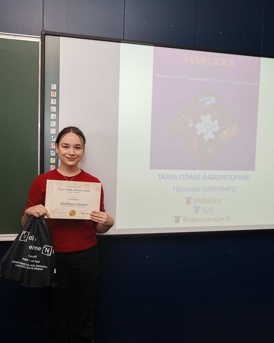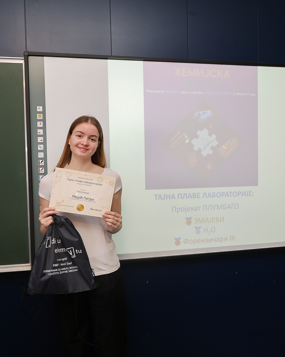 На Природно-математичком факултету у Новом Саду одржана је свечана додела награда учесницима едукативног догађаја Escape room „Хемијска авантура – Тајна плаве лабораторије: пројекат ПЛУМБАГО”, који је окупио средњошколце заинтересоване за хемију, логику и тимски рад.